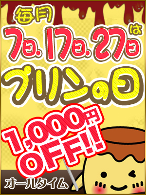 | ☆7の付く日は★プリンの日 毎月 7日 17日 27日はALLタイム1,000円OFF ★合言葉は「プリンの日」です! ※120分コース以上でご利用のお客様に限ります ※日替わりイベントと併用可能!! ※お伝えして頂きませんと適用になりません |