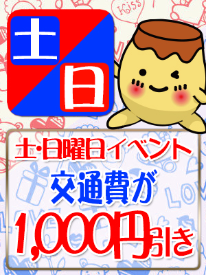 | ☆交通費1.000円キャッシュバック! ※120分コース以上でご利用のお客様に限ります ★合言葉は「土日イベント」です! ※お伝えして頂きませんと適用になりません | |||