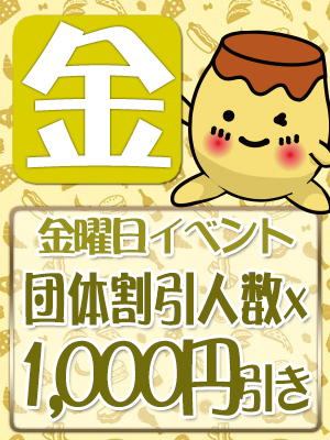 | ☆団体割引人数×1.000円キャッシュバック! ★合言葉は「金曜イベント」です! ※お伝えして頂きませんと適用になりません ※120分コース以上になります。 | |||